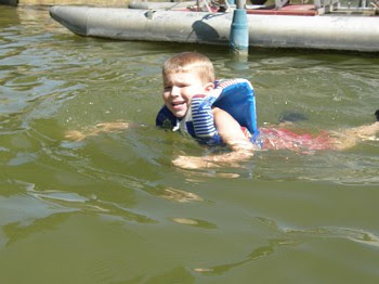 * Friday was our best day weather wise and Ethan played in the water most of the day. He jumped off the dock and even played on the white board. The white board is a piece of foam that floats and you can jump off of it in the water. It does not sound very exciting, but it is a lot of fun. This is our second or third once since Grandma has been at the lake and it is a family tradition now. I was glad to see that Ethan enjoyed it as well.